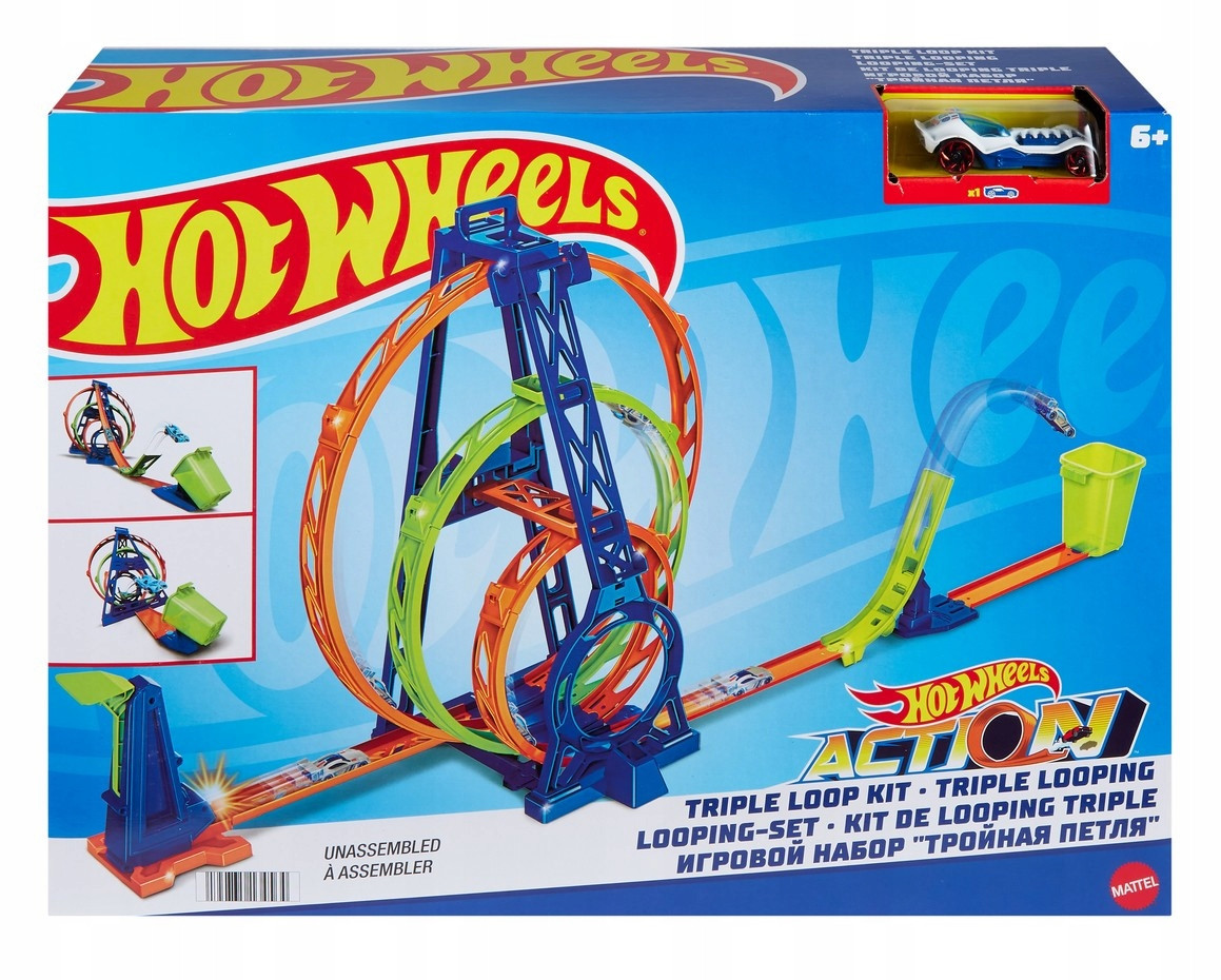 Відзначайся на найнеймовірніші трюки з новим ігровим набором Hot Wheels "Потрійна петля"! Використовуй пусковий пристрій, щоб запустити машинку Hot Wheels (входить до комплекту) на зоні траси та потрапити точно в кошик. Ти зможеш зробити небезпечний стрибок відразу крізь три петлі або подолати потяг, закрутившись у потрійному колообі! З багатофункціональних елементів можна скласти безліч комбінацій і модифікувати трасу під черговий крутий трюк! Цей набір сумісний з іншими ігровими наборами Hot Wheels Конструктор Трас (продаються окремо).